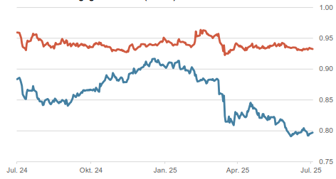 - Zum Schweizer Franken hat der Greenback in den letzten Monaten rund 14% verloren und konsolidiert nun bei rund 0.80. Technisch findet der Kurs auf diesem Niveau Unterstützung. Seit der Euro-Krise von 2011 und der Aufhebung der Kursbindung des Frankens an den Euro durch die SNB im Januar 2015 wurden diese Werte nicht mehr erreicht, was den Nimbus als sicherer Hafen und das Ausmass des Vertrauensverlustes in den Dollar widerspiegelt.